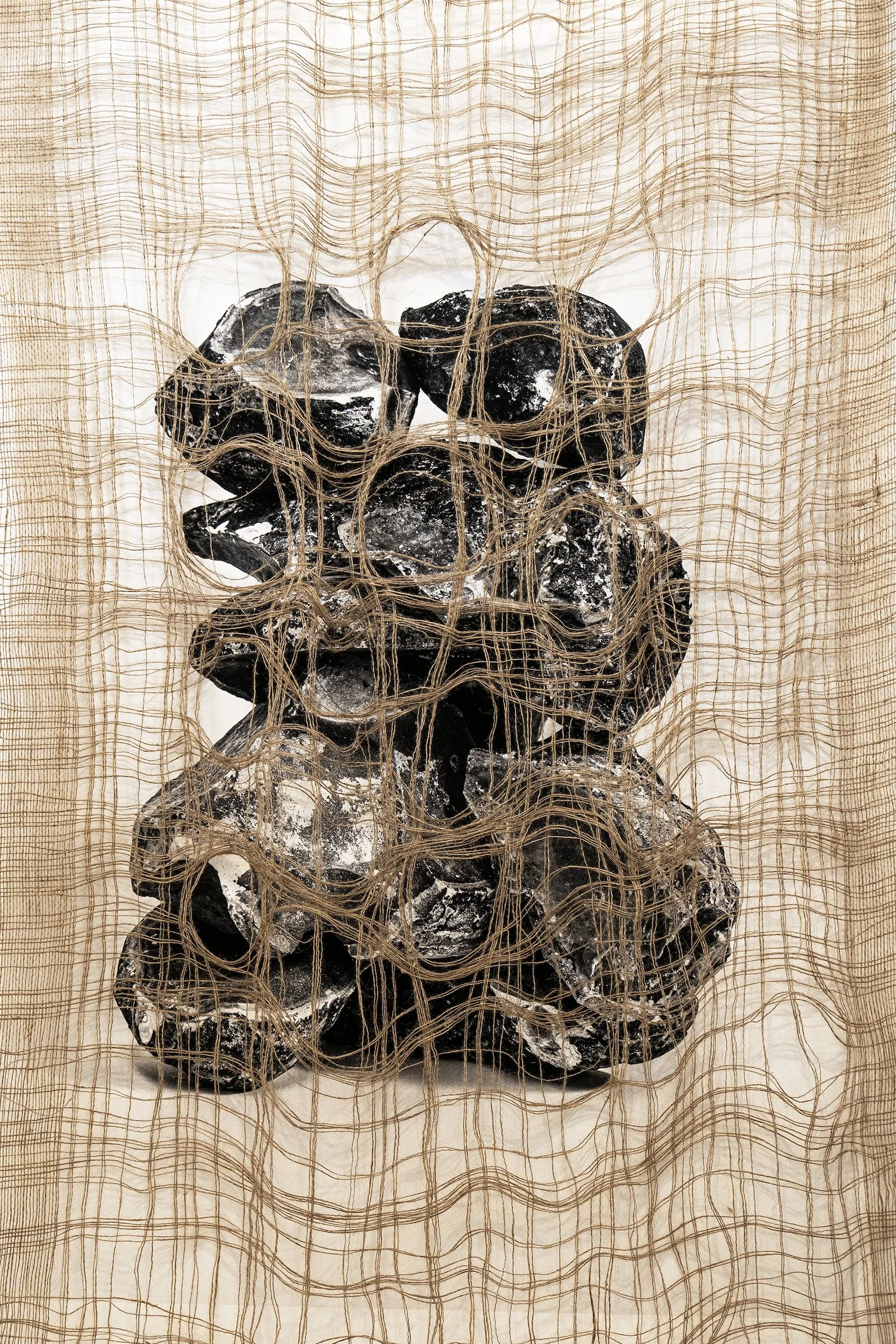 When unraveling a fabric, the textile pattern becomes more evident. The act of fraying is a way of undoing, ultimately revealing its structure. The light fabric covers the rocks like a veil, and I open holes as pores, exposing the morphology of the rear composition (a pile of volcanic stones resembling a temporary sculpture).